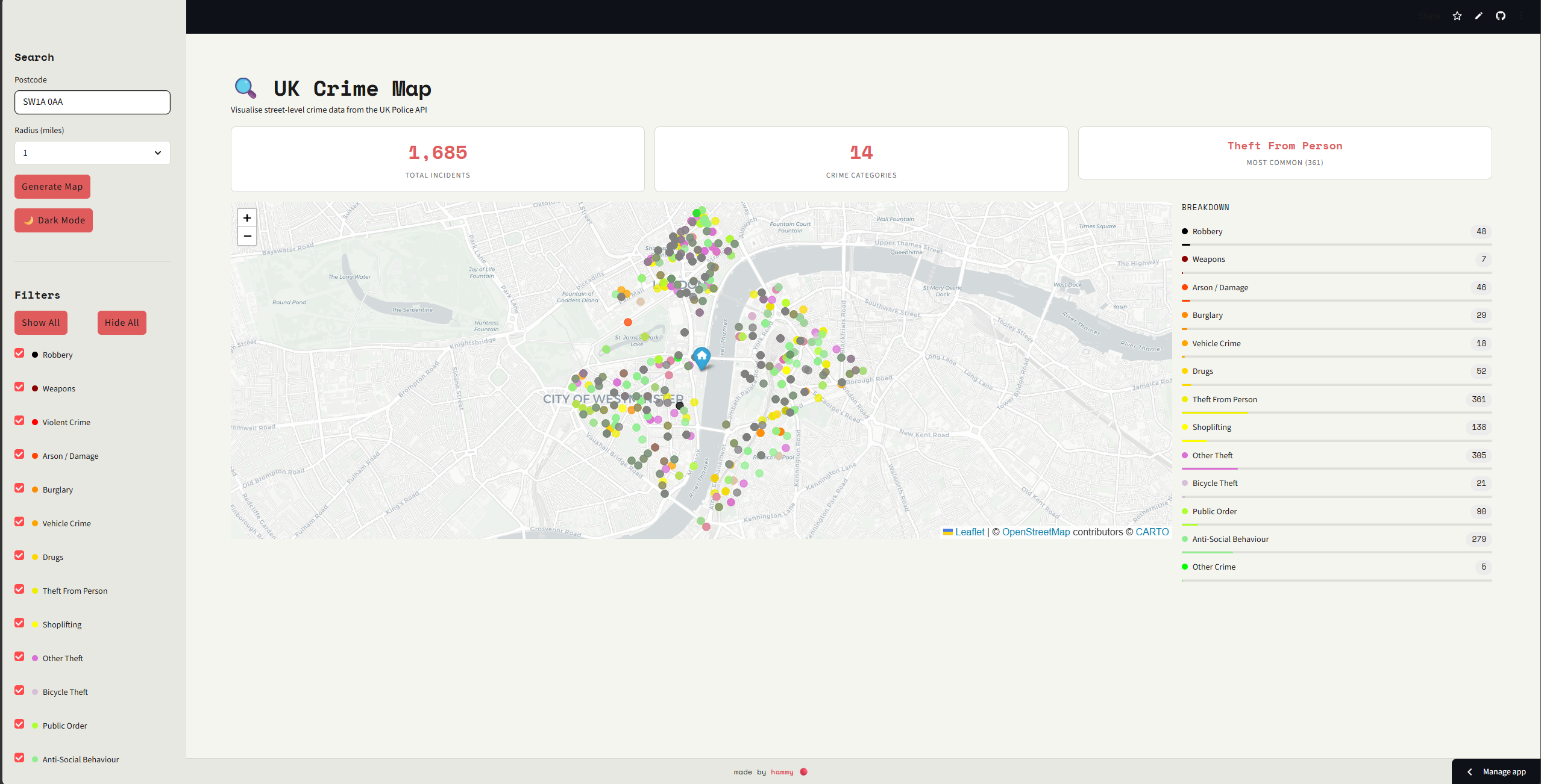 A spatial analysis tool that visualizes real-time street-level crime data across the UK by integrating the Police.uk and Postcodes.io APIs into an interactive dashboard.